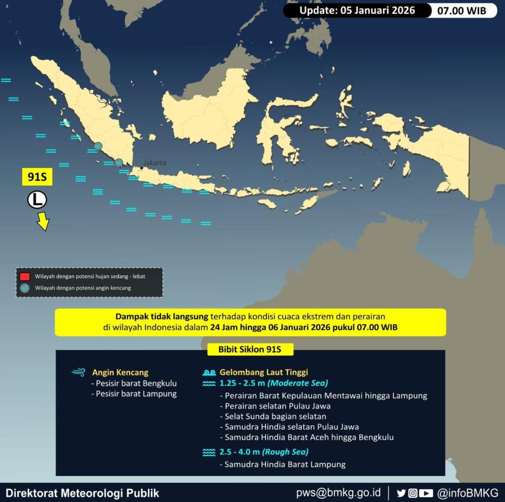Bibit Siklon Tropis 91S (7.9°LS, 93.0°BT) di Samudra Hindia barat daya Lampung memicu peningkatan kecepatan angin dan tinggi gelombang di perairan Indonesia. Pola angin di wilayah Indonesia bagian utara umumnya bergerak dari Barat Laut hingga Timur Laut dengan kecepatan angin berkisar 6 – 25 knot, sedangkan di wilayah Indonesia bagian selatan umumnya bergerak dari Barat Daya hingga Barat Laut dengan kecepatan angin berkisar 6 – 25 knot. Kecepatan angin tertinggi terpantau di Laut Natuna Utara dan Samudra Hindia barat Bengkulu hingga Lampung.
