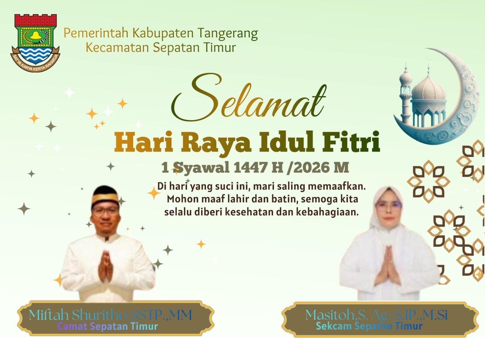 Miftah Shuritho,SSTP.,MM Yang Sering disapa Bang Miftah. Camat Sepatan Timur. Menyampaikan, dengan harapan semoga Puasa tahun ini membawa berkah bagi kita semua dan akhirnya kita mendapatkan kemenangan di hari yang fitri kelak dengan merayakan idul fitri 1447 H / 2026 M.