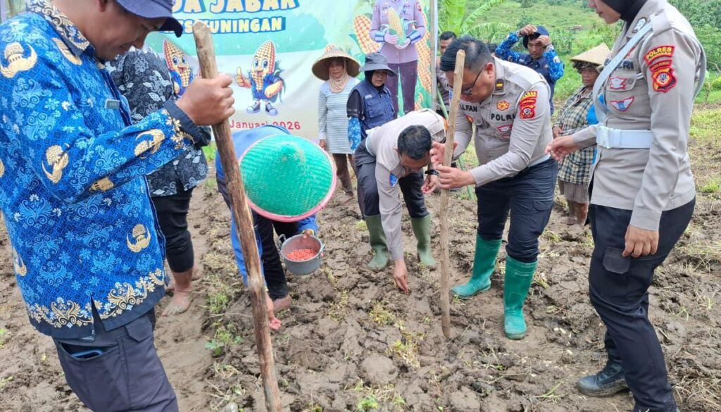 SwaraJabar.com | Kuningan — Tugas polisi lalu lintas (polantas) tidak melulu soal mengatur arus kendaraan di jalan raya. Jajaran Satuan Lalu Lintas (Satlantas) Polres Kuningan membuktikan peran sosialnya dengan terjun langsung ke sawah, menanam jagung di lahan seluas 2 hektare di Desa Cibulan, Kecamatan Cidahu, Kamis (29/1/2026).